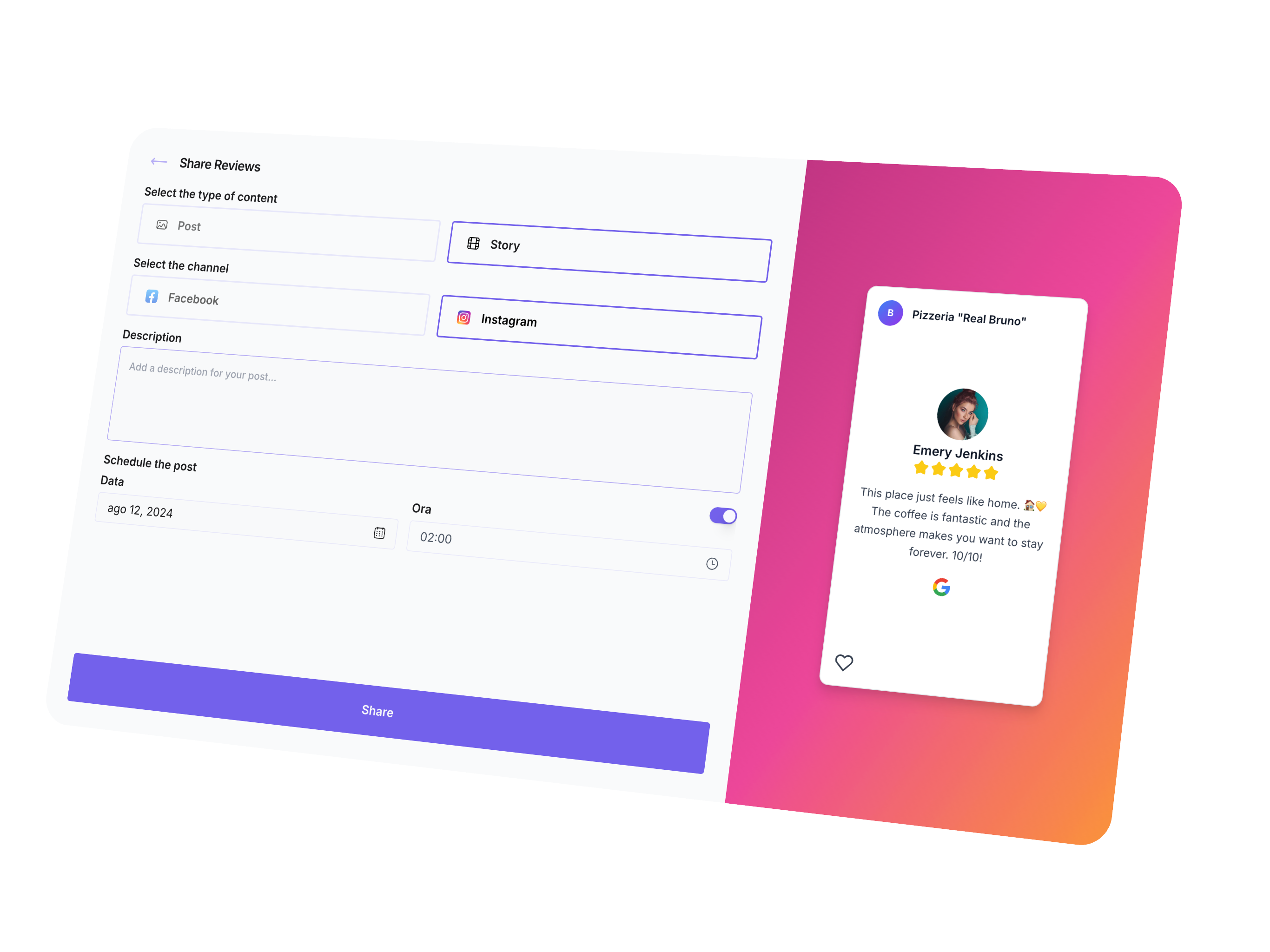 Transformez vos avis 5 étoiles en publications Instagram et Facebook. Créez des visuels attractifs en un clic. Programmez vos posts ou laissez l'IA publier automatiquement.