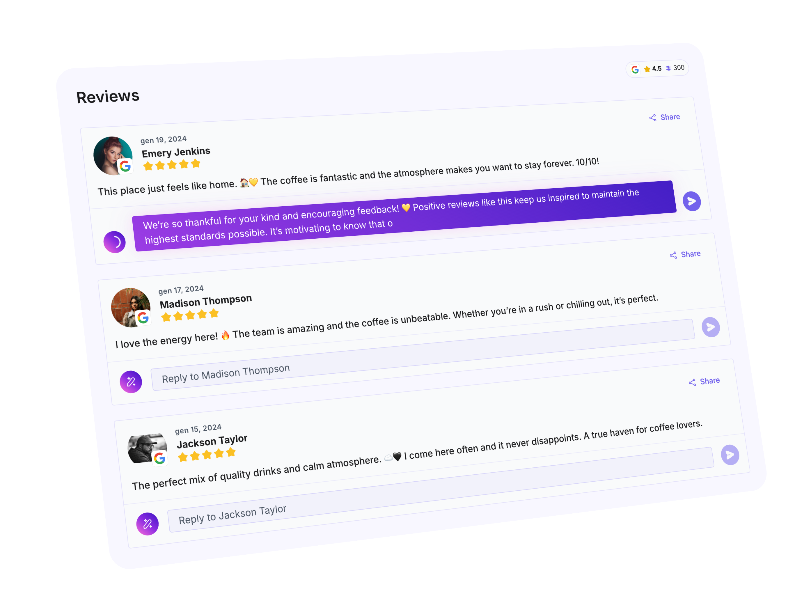 Visualisez et répondez à tous vos avis Google, Yelp, TripAdvisor, Booking au même endroit. Plus besoin de jongler entre les plateformes. Gagnez des heures chaque semaine.
