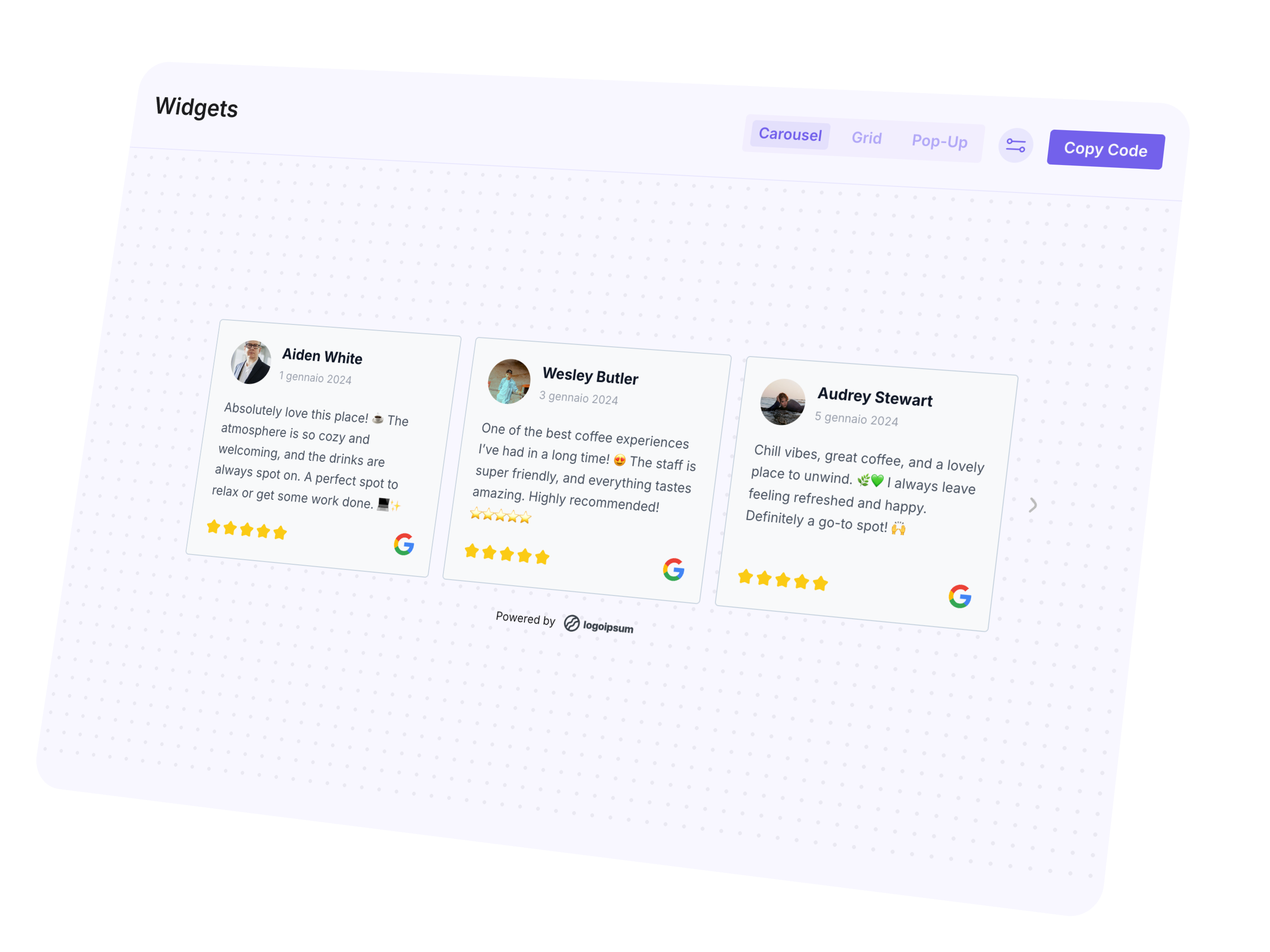 Affichez automatiquement vos meilleurs avis avec des widgets élégants. Carrousel, grille ou pop-up. Mise à jour en temps réel. Installation en 30 secondes par copier-coller.
