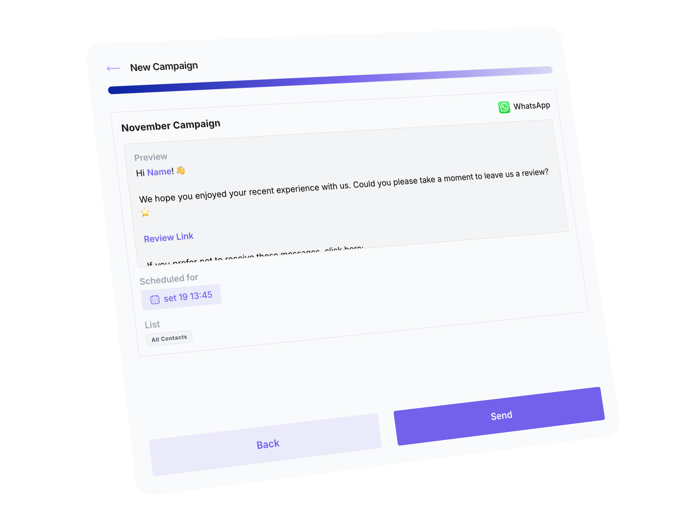 Créez des campagnes personnalisées et envoyez des demandes d'avis en masse. Programmez l'envoi, suivez les résultats en temps réel. Collectez des dizaines d'avis sans effort.