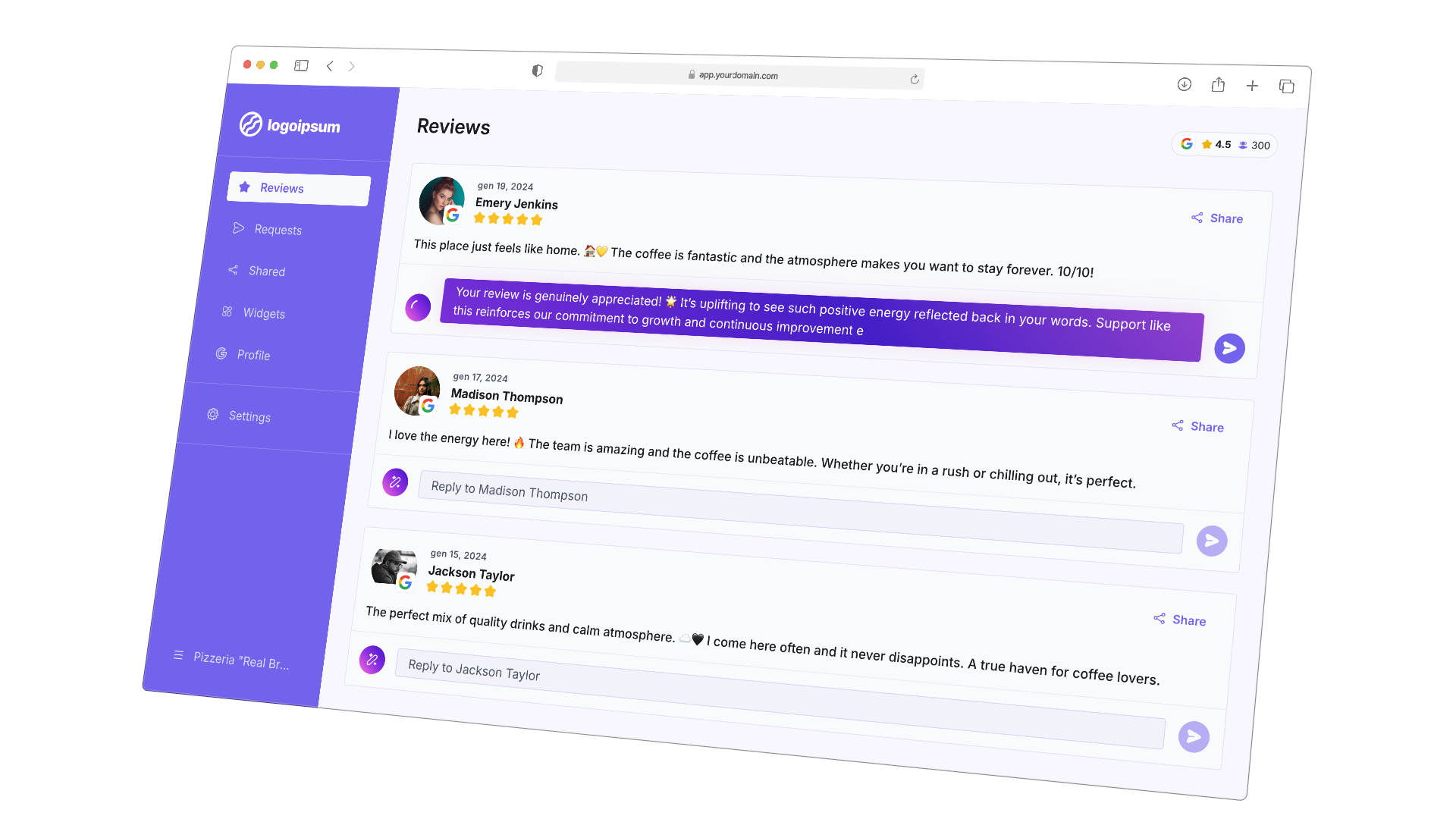 Visualisez et répondez à tous vos avis Google, Yelp, TripAdvisor, Booking au même endroit. Plus besoin de jongler entre les plateformes. Gagnez des heures chaque semaine.