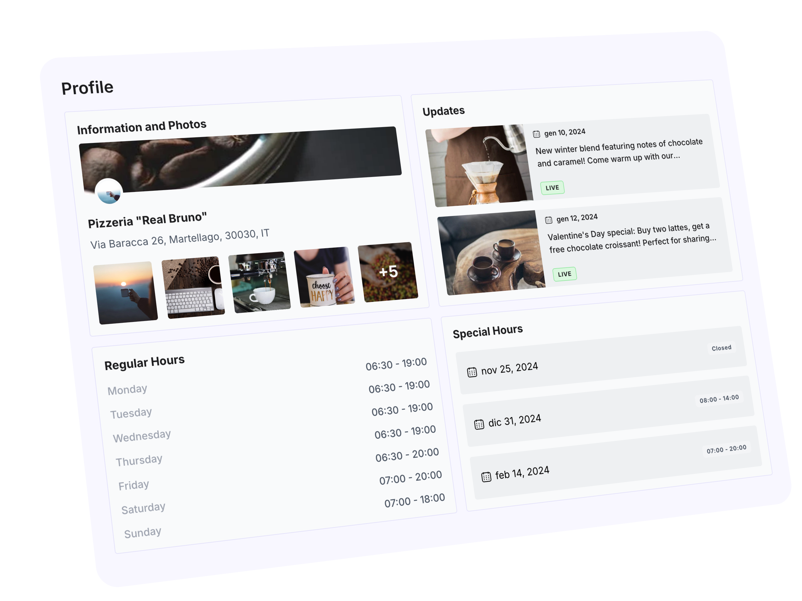Mettez à jour vos informations, horaires, photos et publiez des actualités directement depuis Vitriz. Optimisez votre visibilité locale sans quitter l'application.